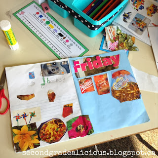 I put out magazines and flyers and had the kids make a collage of things that they liked or things that inspired them. They really got into it! One student cut out a green pillow and said the green in the pillow inspired them to want to write about aliens. I laughed at the one in the picture below….yup, Friday inspires me too!