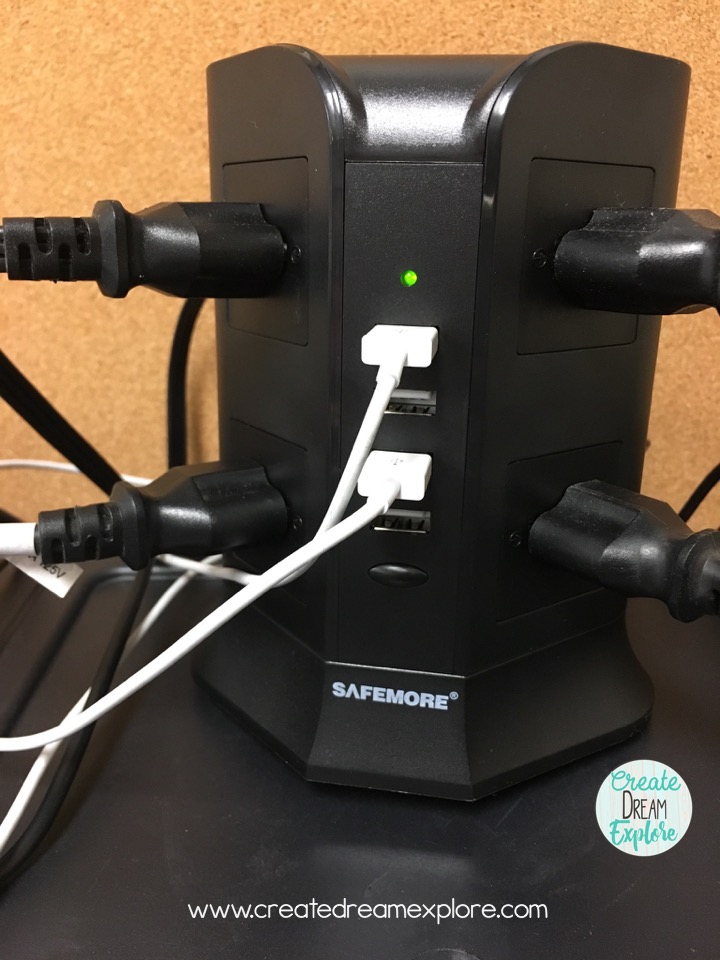 My other classroom technology bummer was that I didn’t have enough outlets near my tech storage area. I had one power bar so I could charge 5 devices at a time plus one ipad mini in the other half of the outlet. I didn’t want to have 2 power bars. So I ordered this power bar tower: